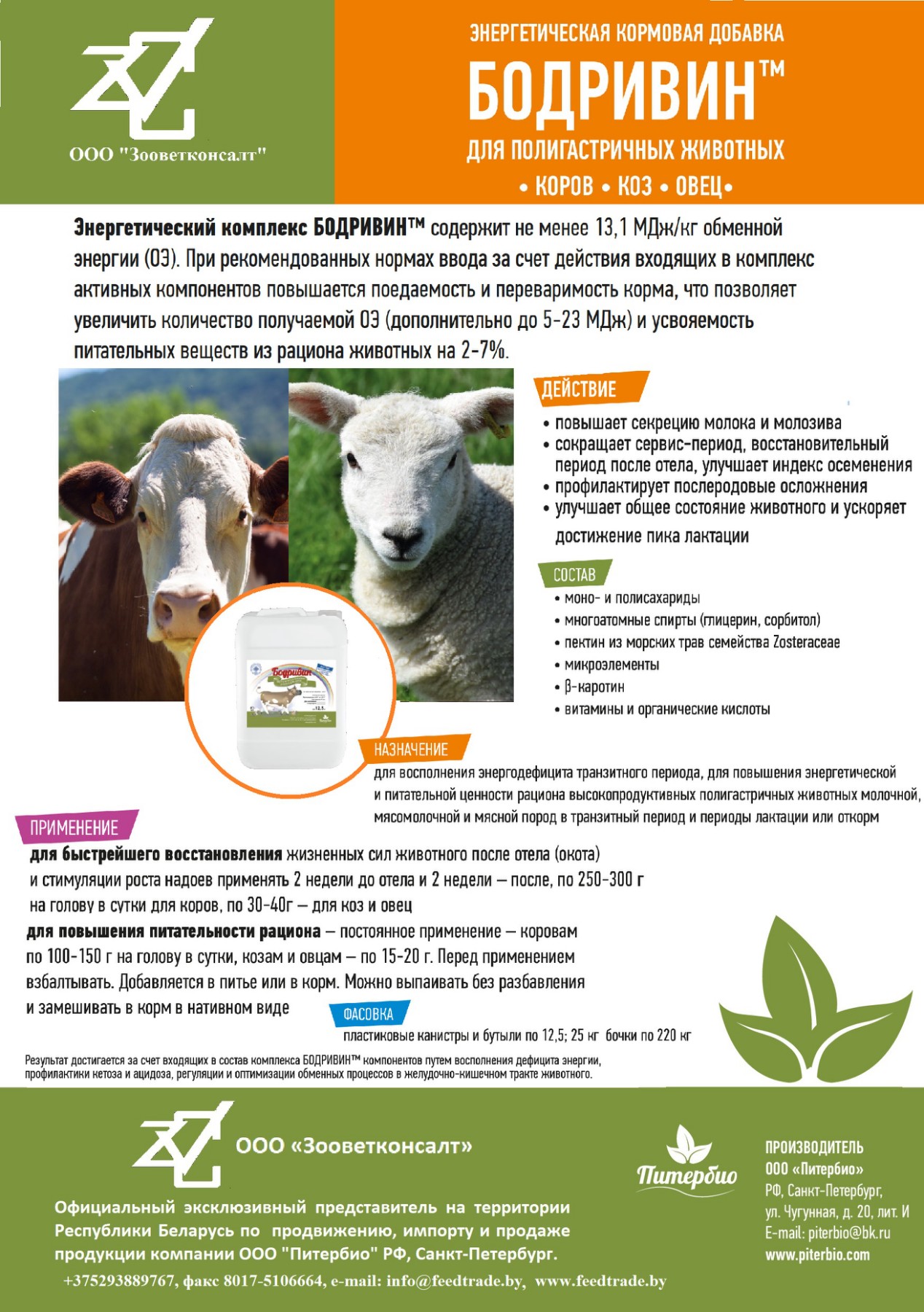 Статья А.В. Святковский - Бодривин - эффективный помощник животноводаБодривин - комбинация натуральных продуктов (моно- и полисахариды, глицерин и другие многоатомные спирты, пектин из морских трав семейства Zosteraceae, микроэлементы, каротиноиды, источники витаминов и органические кислоты), предназначается для повышения энергетической и питательной ценности рациона высокопродуктивных полигастричных животных молочной и мясомолочной пород в транзитный период и период лактации.